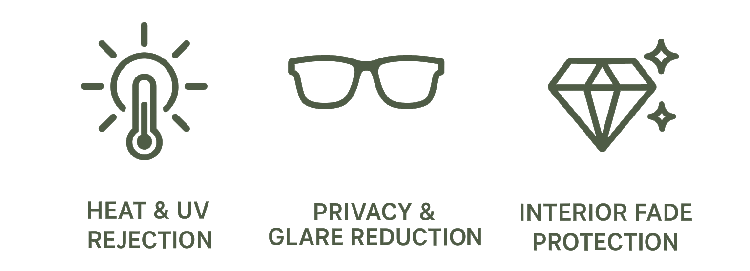 Icons representing heat and UV rejection, privacy and glare reduction, interior fade protection.