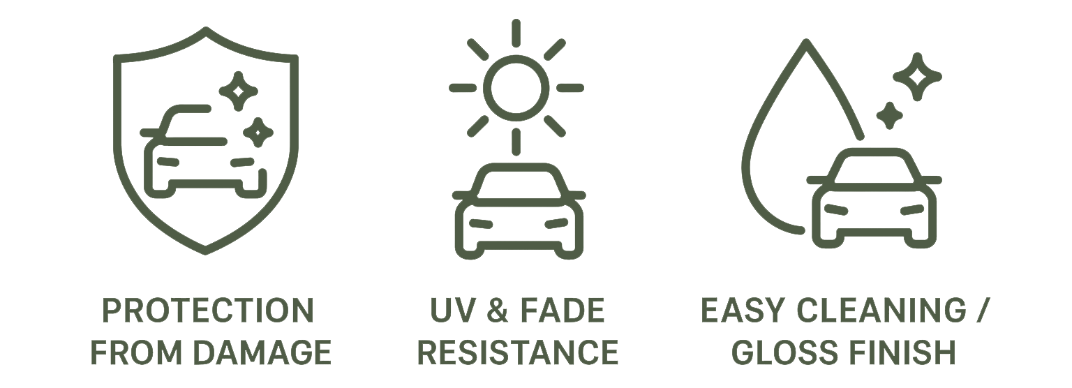 Icons representing car protection, UV resistance, and easy cleaning with gloss finish.