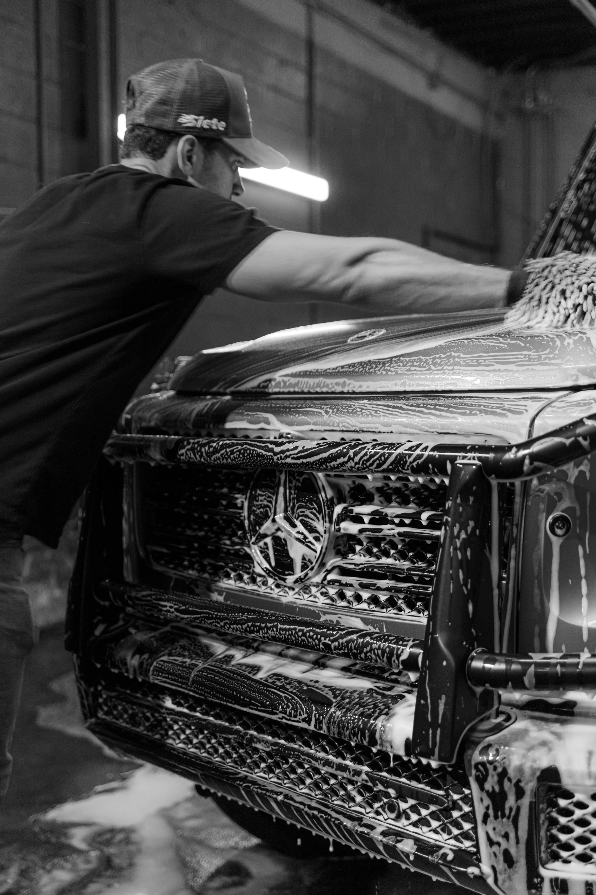 A man carefully washing a sleek Mercedes-Benz G-Wagon, methodically rinsing away the dirt and polishing its glossy surface.